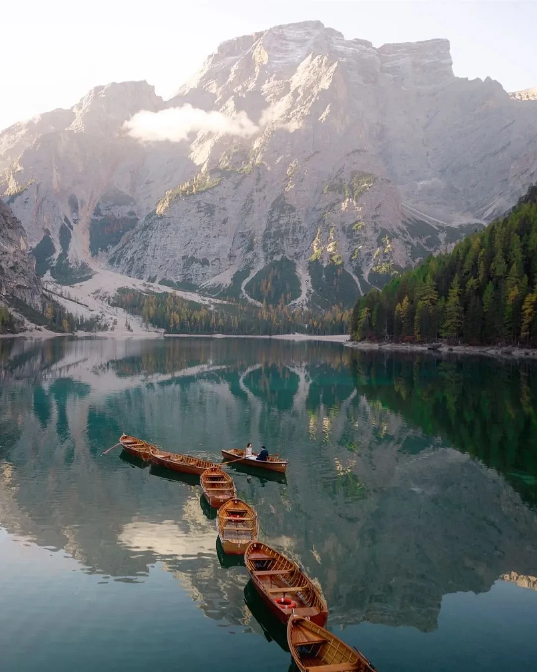 This is the moment when the intimacy ends, the opportunity to take photos of the empty lake, just the two of you, against the backdrop of the majestic Dolomites. Then the lake is flooded with boats, and the line of people waiting to board the boats stretches all day long.